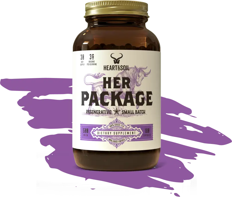 Her Package is the foundational supplement included in the Female Vitality Stack. It provides unique and essential support found in grass-fed and grass-finished ovary, uterus, fallopian tubes, liver, and kidney. These powerful organs include 12+ powerful nutrients to help reach your goals.