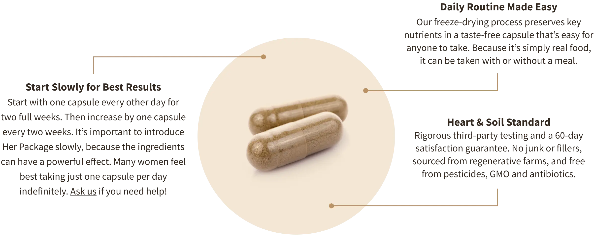 Start with one capsule every other day for two full weeks. Then increase by one capsule every two weeks. It’s important to introduce Her Package slowly, because the ingredients can have a powerful effect. Many women feel best taking just one capsule per day indefinitely. Ask us if you need help!