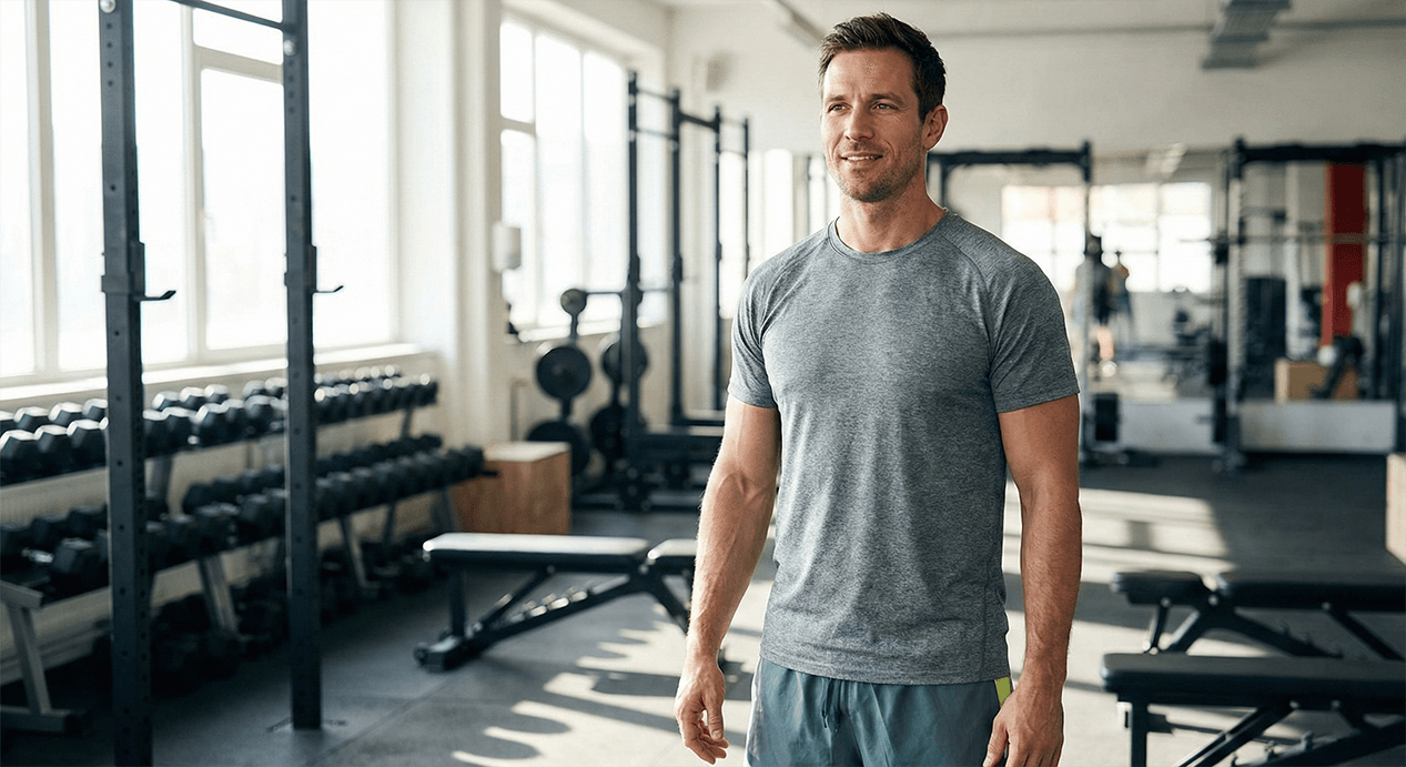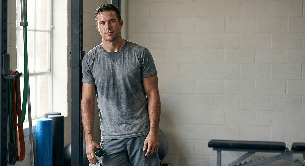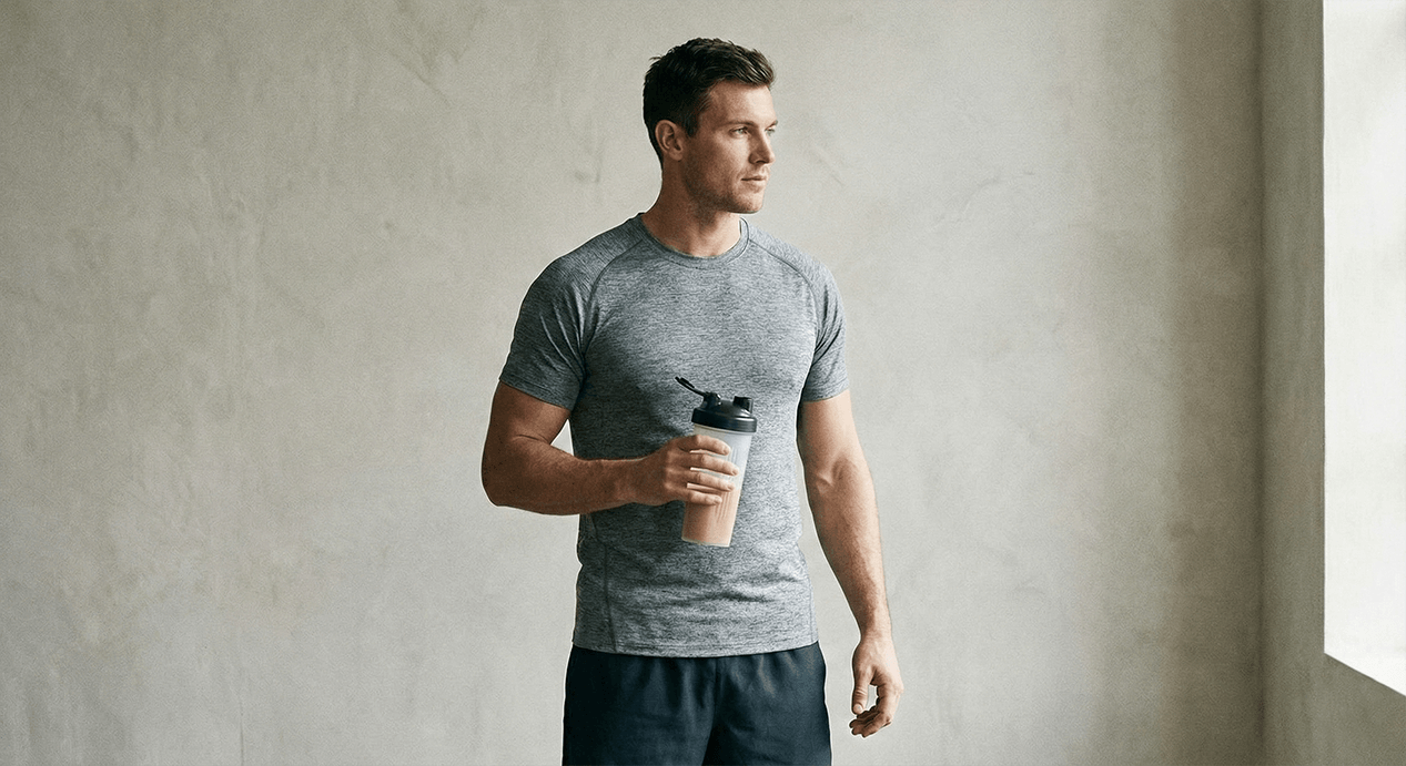 A man in a grey athletic shirt and black shorts holds a shaker bottle while looking to his right.