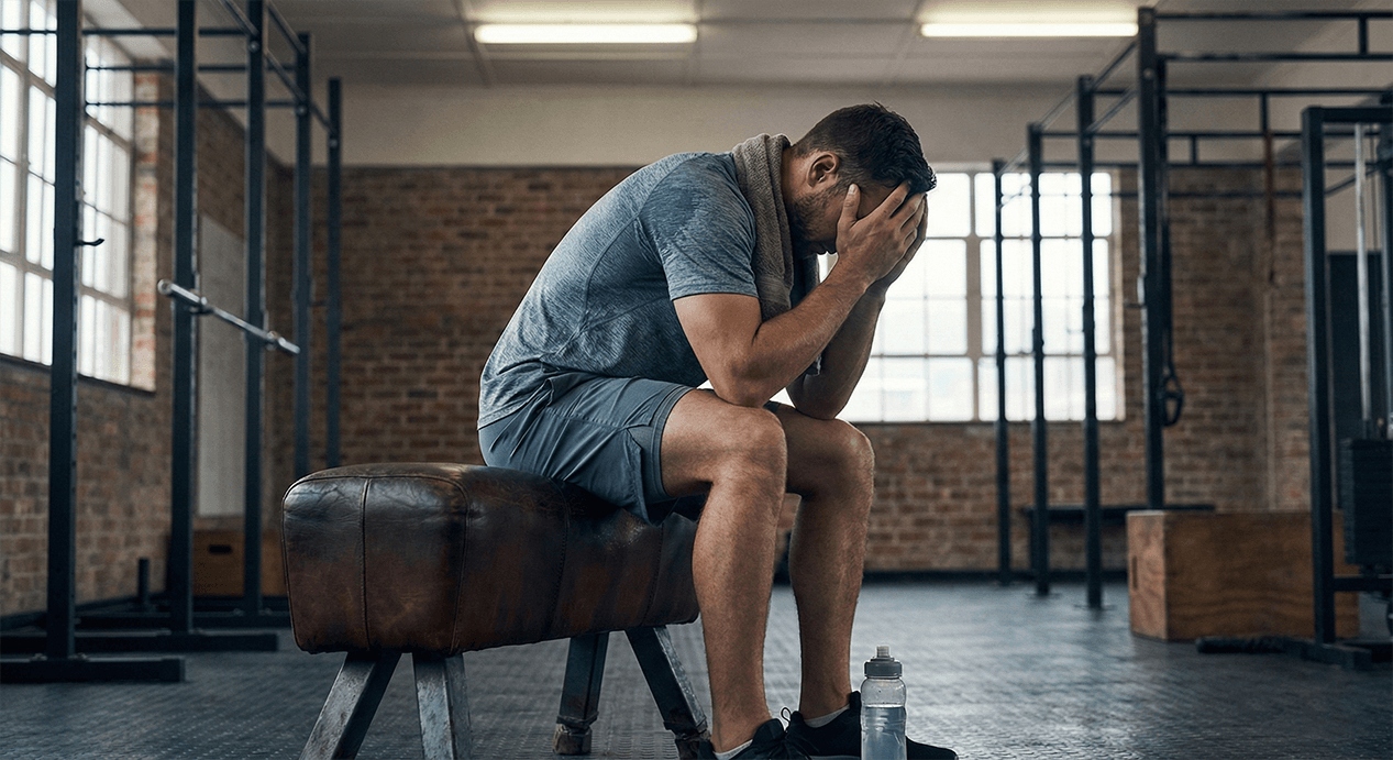 A man in workout clothes sits on a pommel horse in a gym with his head in his hands.