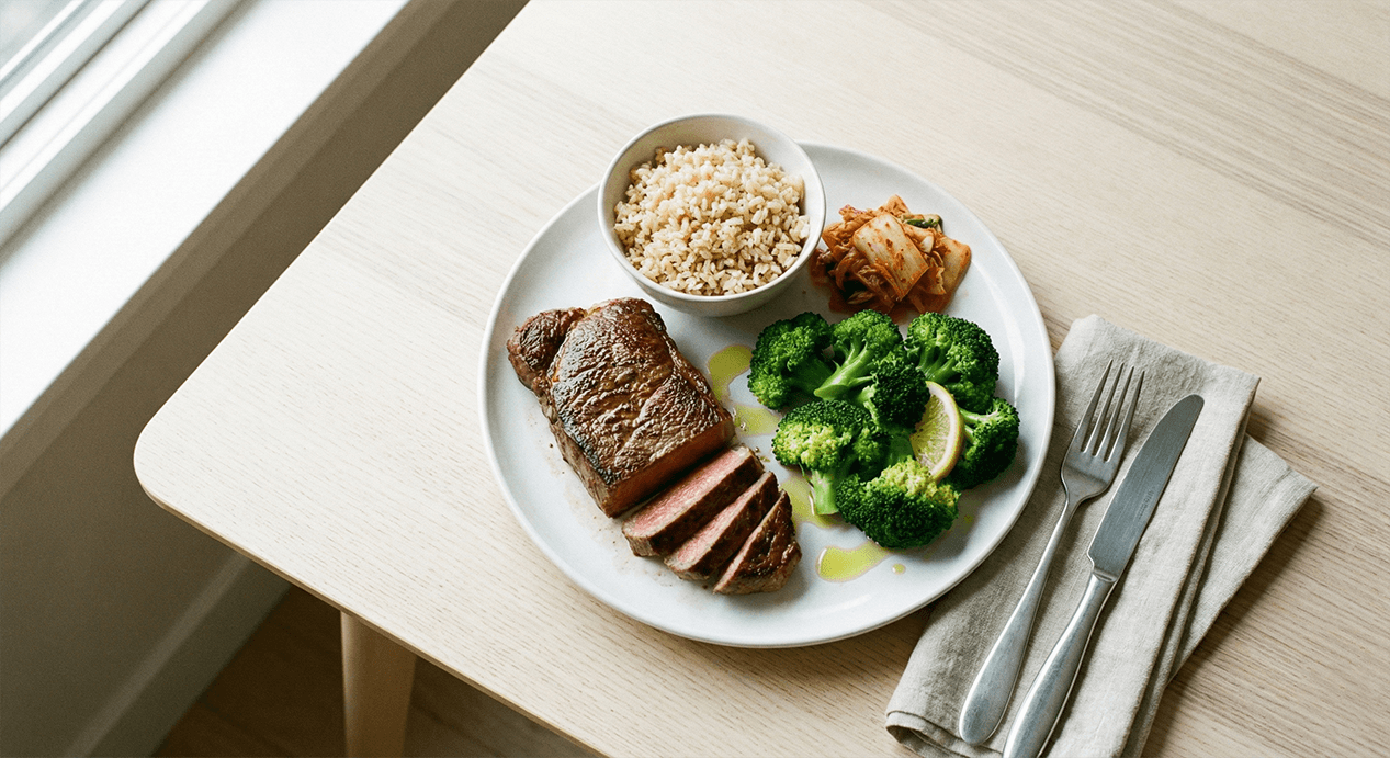 A plated meal of sliced steak, broccoli, brown rice, and kimchi on a light wood table.