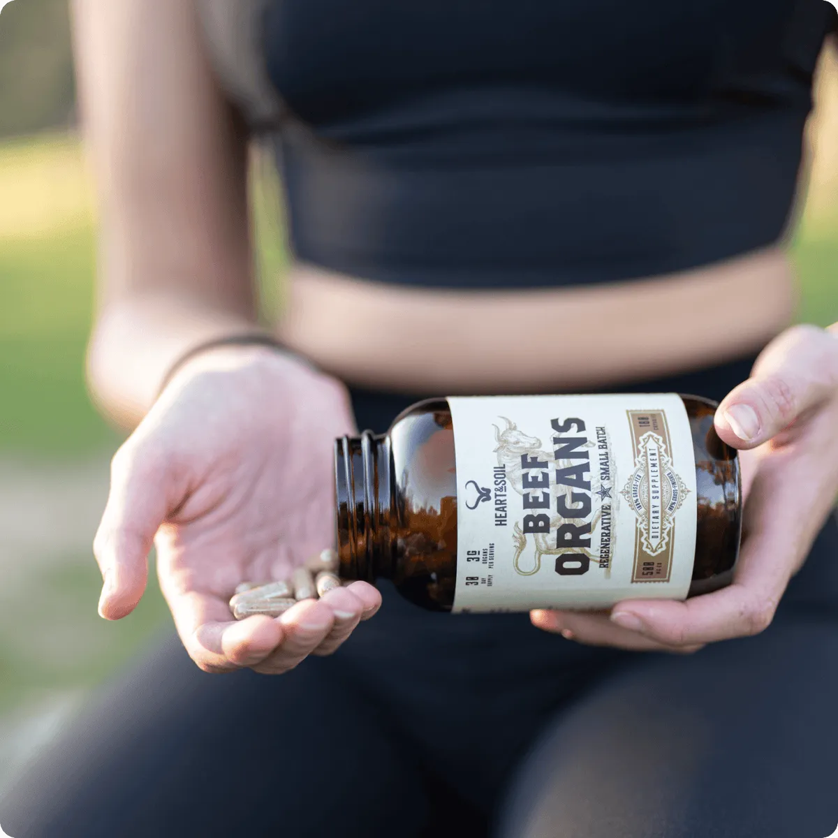A person holds a bottle of Beef Organs supplements, pouring several capsules into their hand.