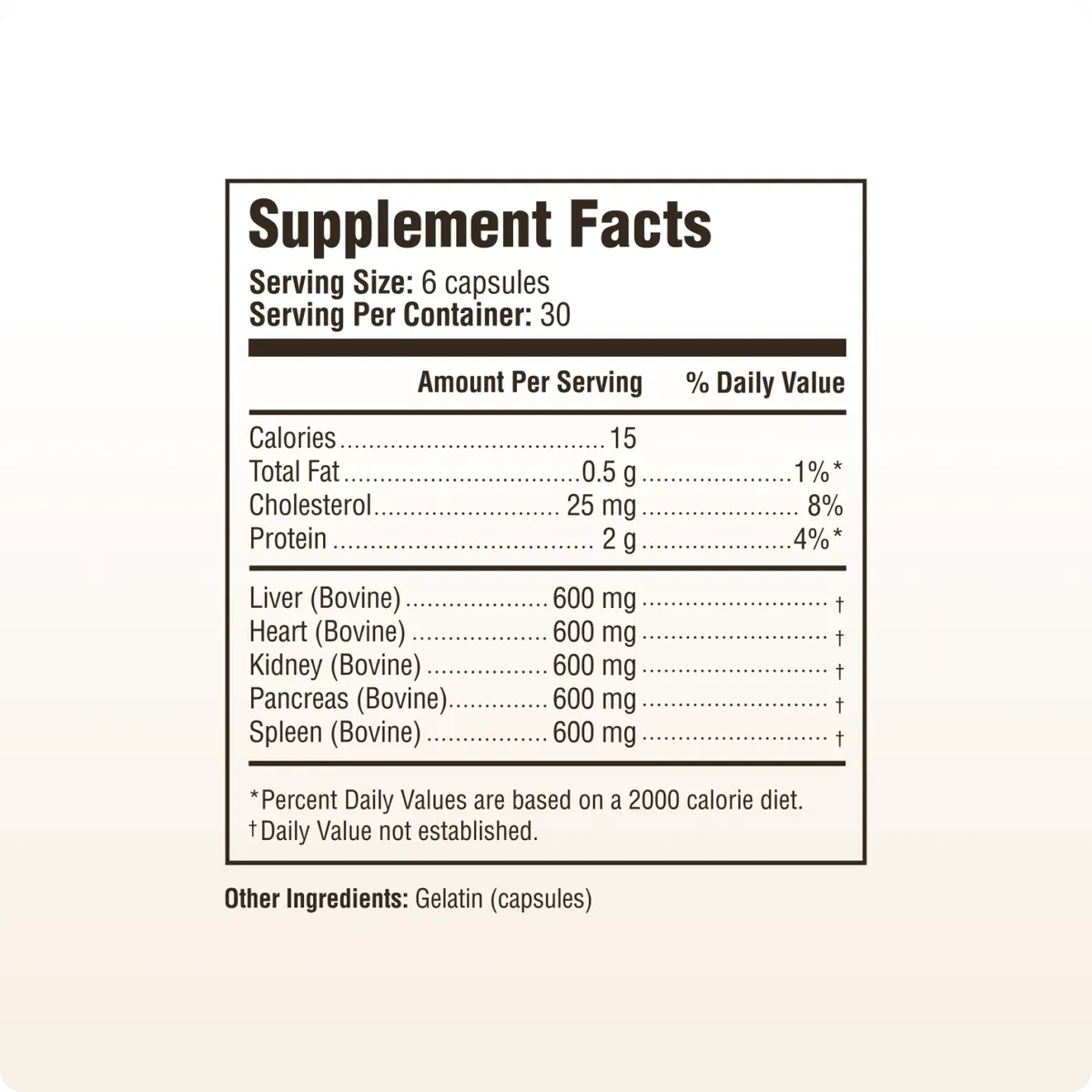 The supplement facts label for a bovine organ complex, listing ingredients like liver, heart, and kidney.