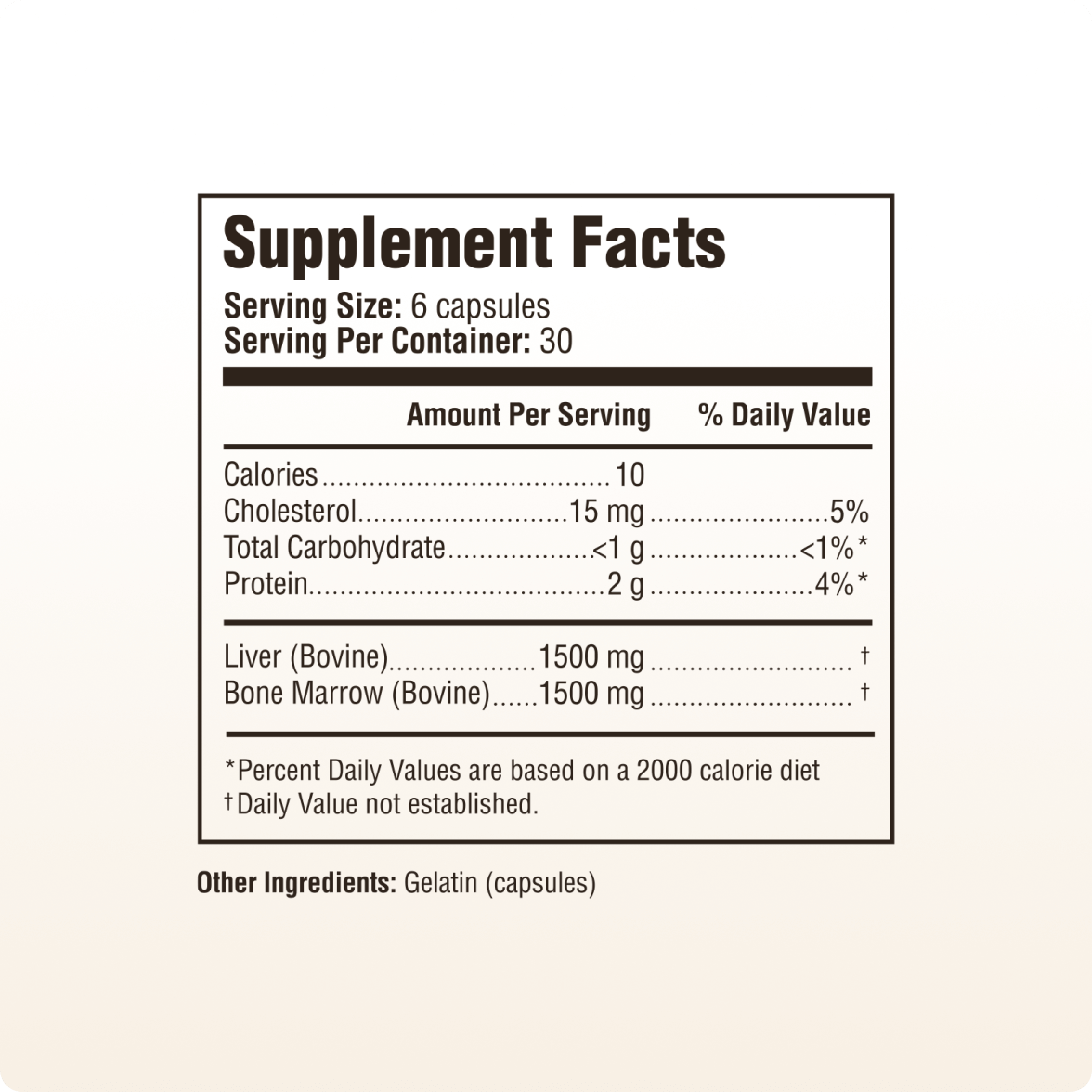 Bone Marrow & Liver is specifically formulated to support bone & connective tissue health, skin health, emotional well-being, and overall vitality by delivering bioavailable nutrients sourced from premium-quality, 100% grass-fed organs.†