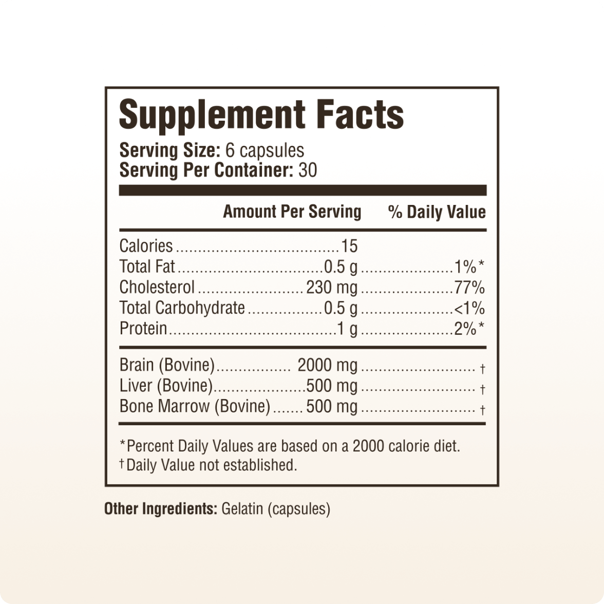 - Grass-fed & finished brain (including the cortex, hypothalamus, pituitary, and pineal gland), bone marrow, and liver